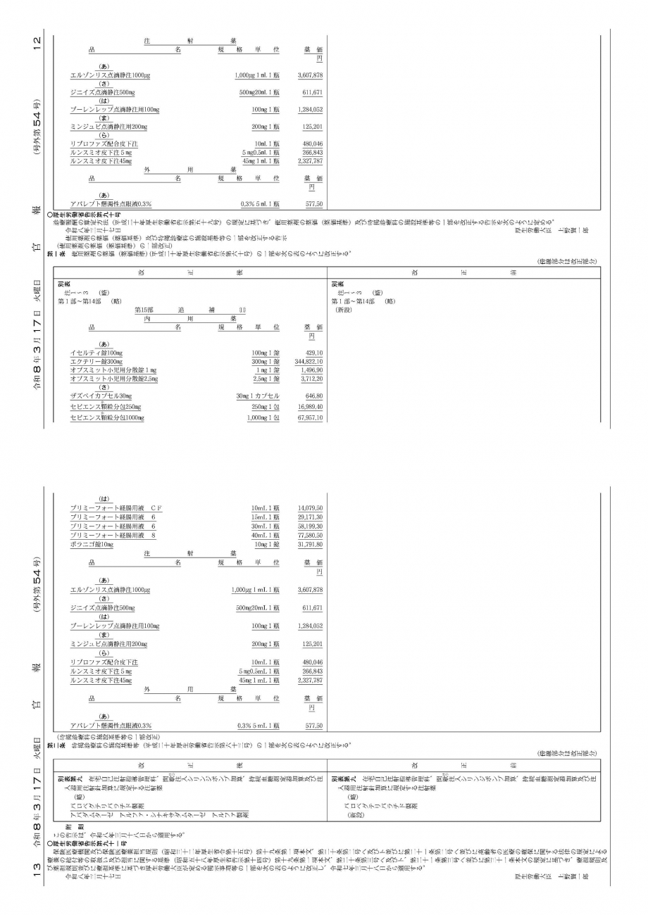 2026年3月17日告示・18日適用 緊急収載告示