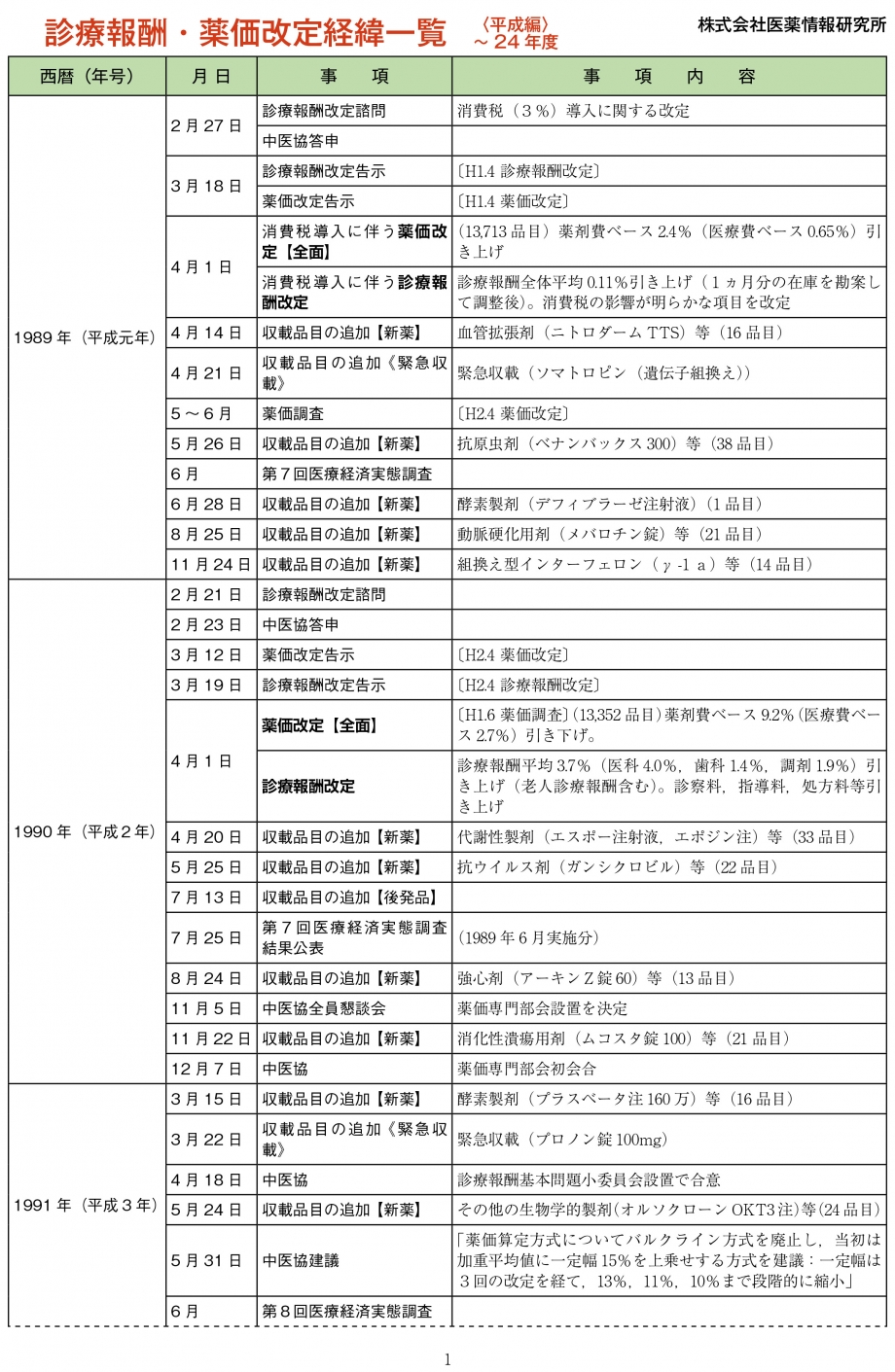 診療報酬・薬価改定経緯一覧(平成編)