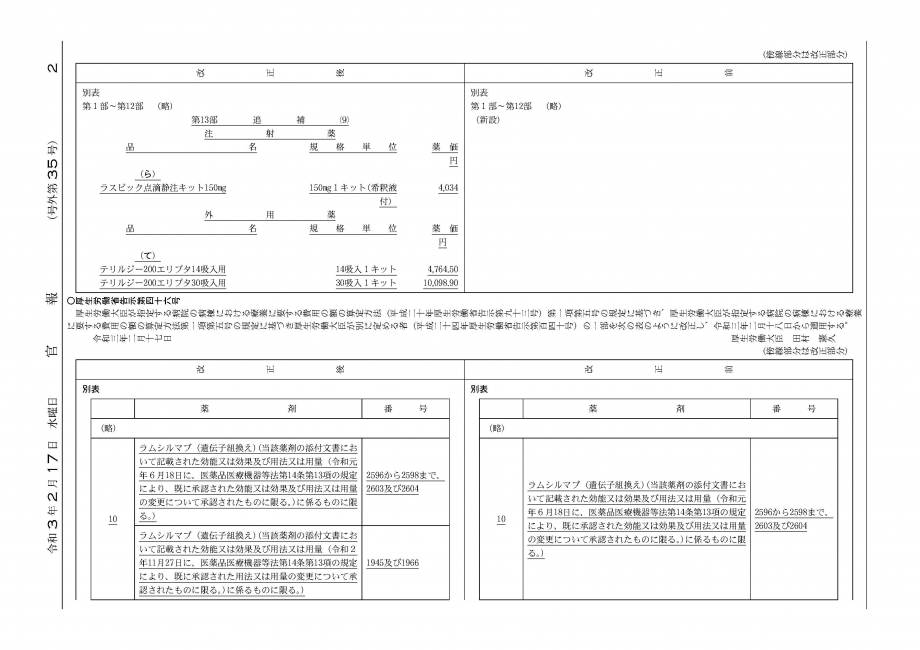 2021年2月17日告示・18日適用 新薬告示