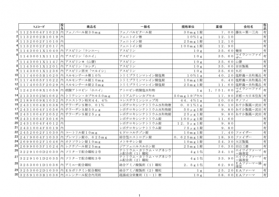 ※会社名欄が空欄のものは統一名収載品目の告示名称です。