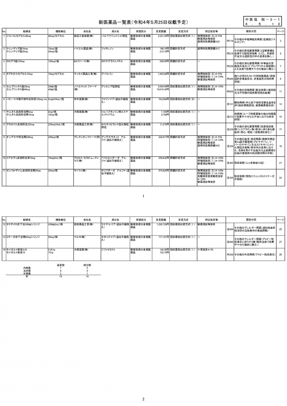2022年5月18日 医薬品の薬価収載