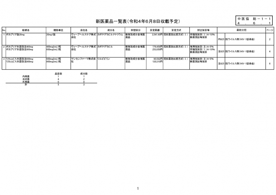 2022年6月1日 医薬品の薬価収載