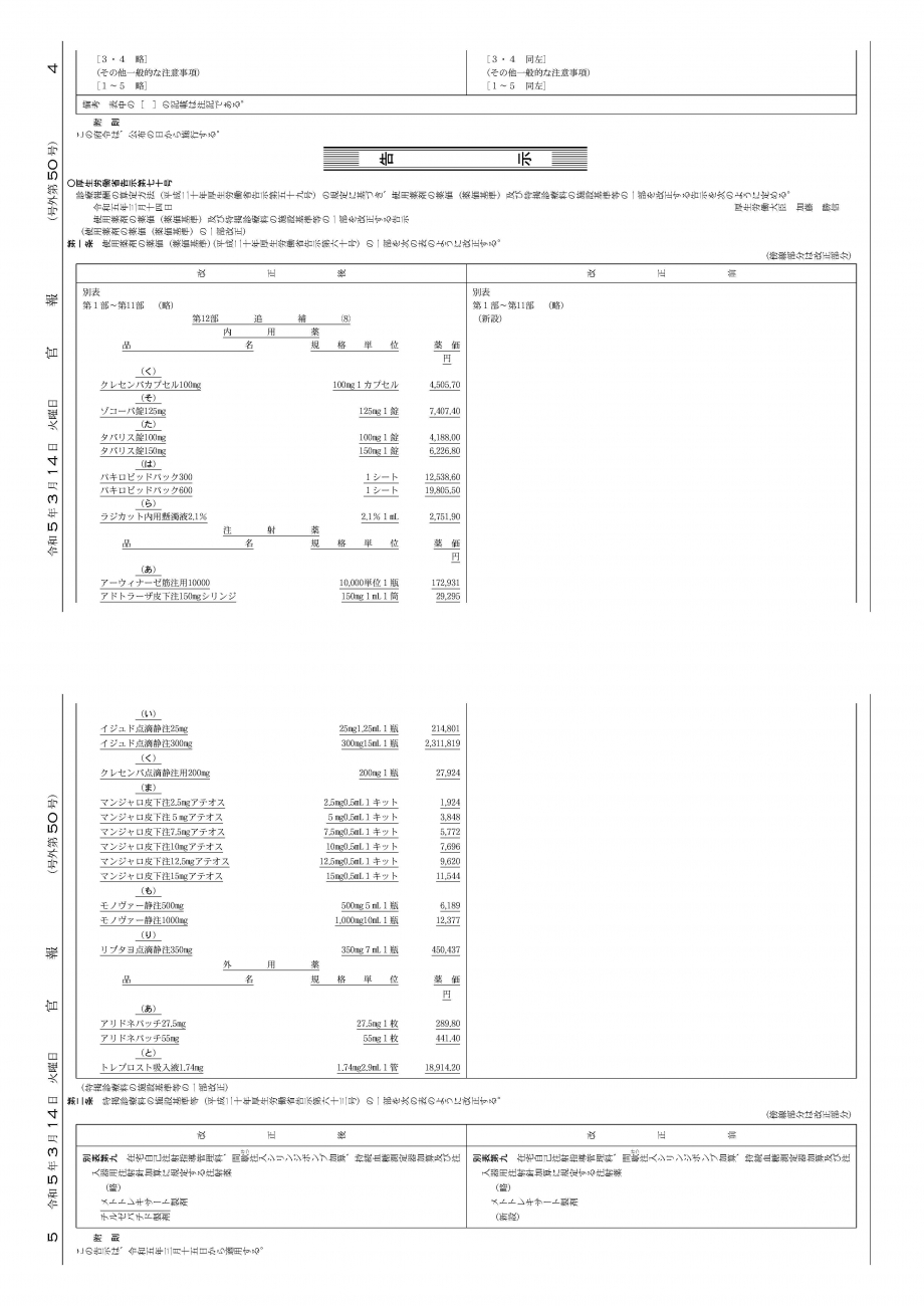2023年3月14日告示・15日適用 新薬告示