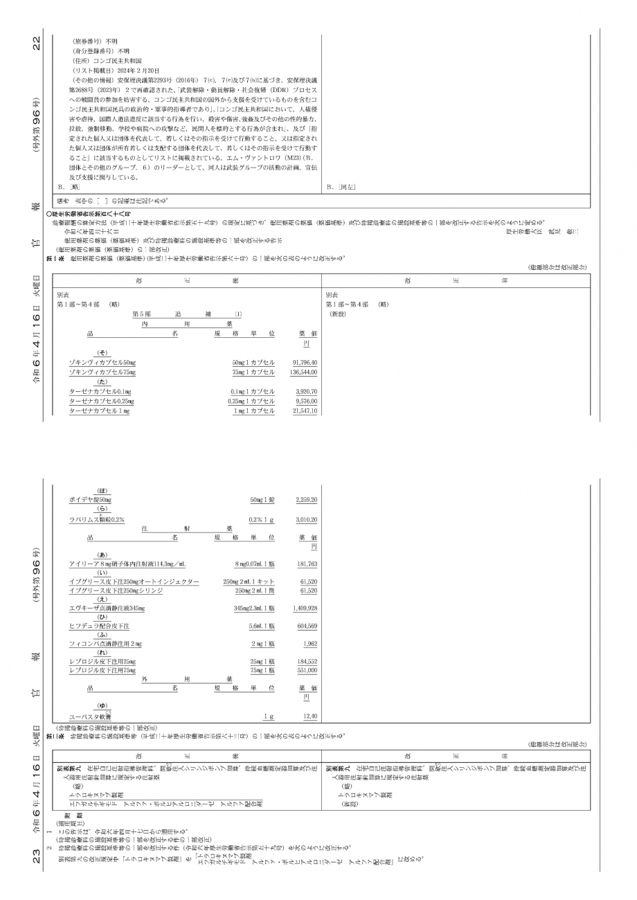 2024年4月16日告示・17日適用 新薬等告示