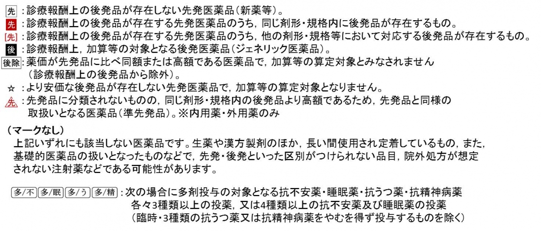 ★“他の剤形・規格に後発品の存在する先発医薬品”,“より安価な後発品が存在しない先発医薬品”など,最新の制度で複雑化した区分も色付きマーク化。 算定上の位置づけをわかりやすく示します。