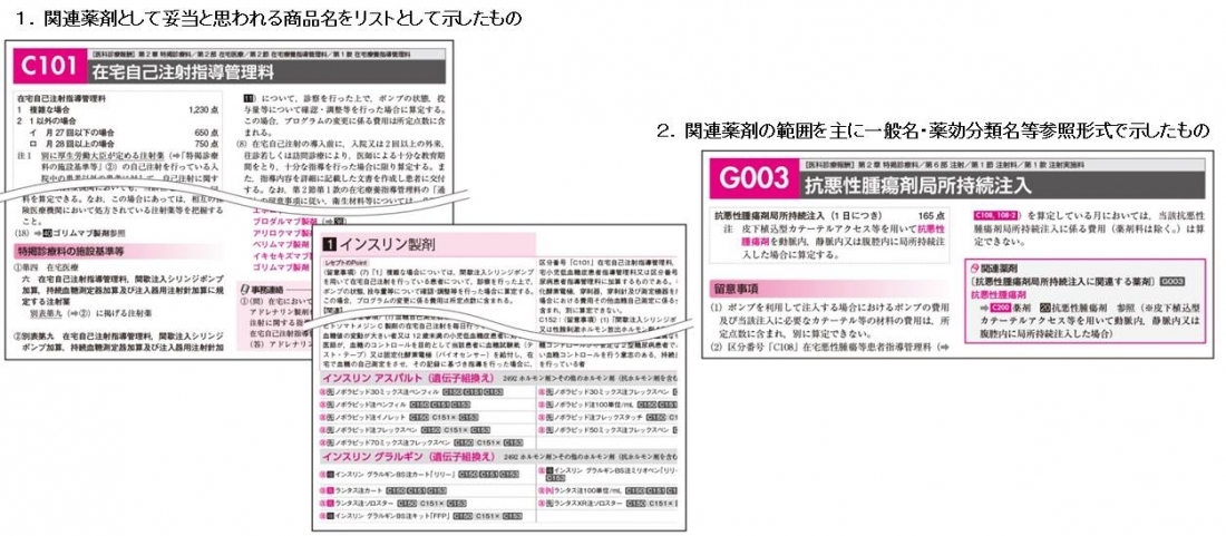 2.関連薬剤の範囲を主に一般名・薬効分類名等,参照形式で記したもの(当該項目の告示・通知等に続き「関連薬剤」枠内で表記)