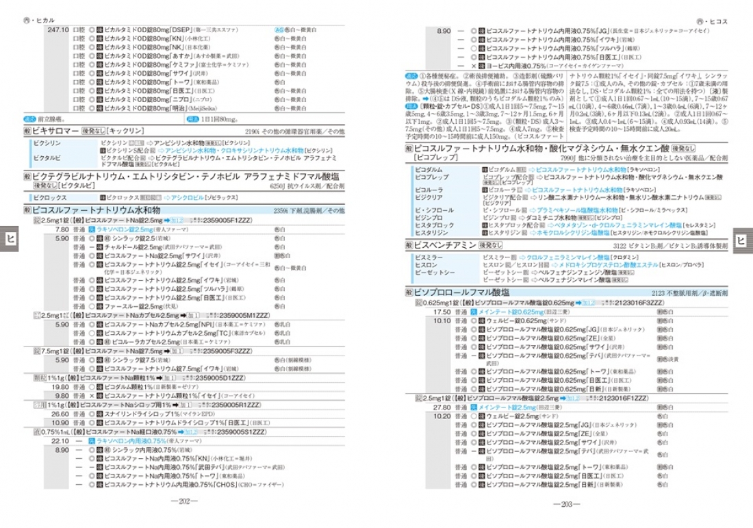 新しい制度にあわせ,一般名処方加算の対象となる製品群に,厚生労働省が公表した「一般名の標準的な記載」および「一般名コード」を表示,さらに処方せんの「種類」の計算に算定できる「最低薬価」に対し,分かりやすく印をつけました。同様に厚生労働省が示した先発品情報や後発除外品目(薬価算定の結果,先発品より高額・同額のため,診療報酬上の後発品とはみなさないとされた品目)の情報に加え,改定により範囲が広がった,同一視される剤形の整理にも対応できるよう表記を工夫しました。