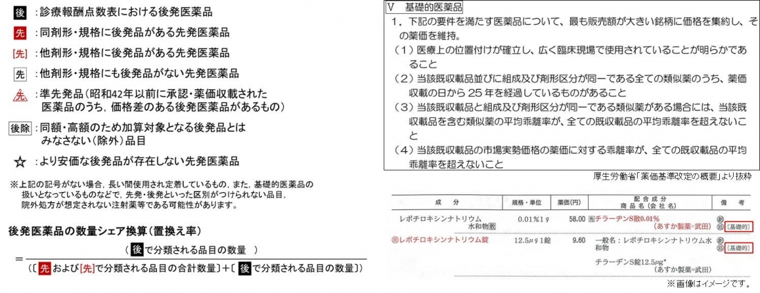 「基礎的医薬品」は,対象となる成分については薬価が維持され,「後発品の数量シェア(置換え率)の計算」には含まれません