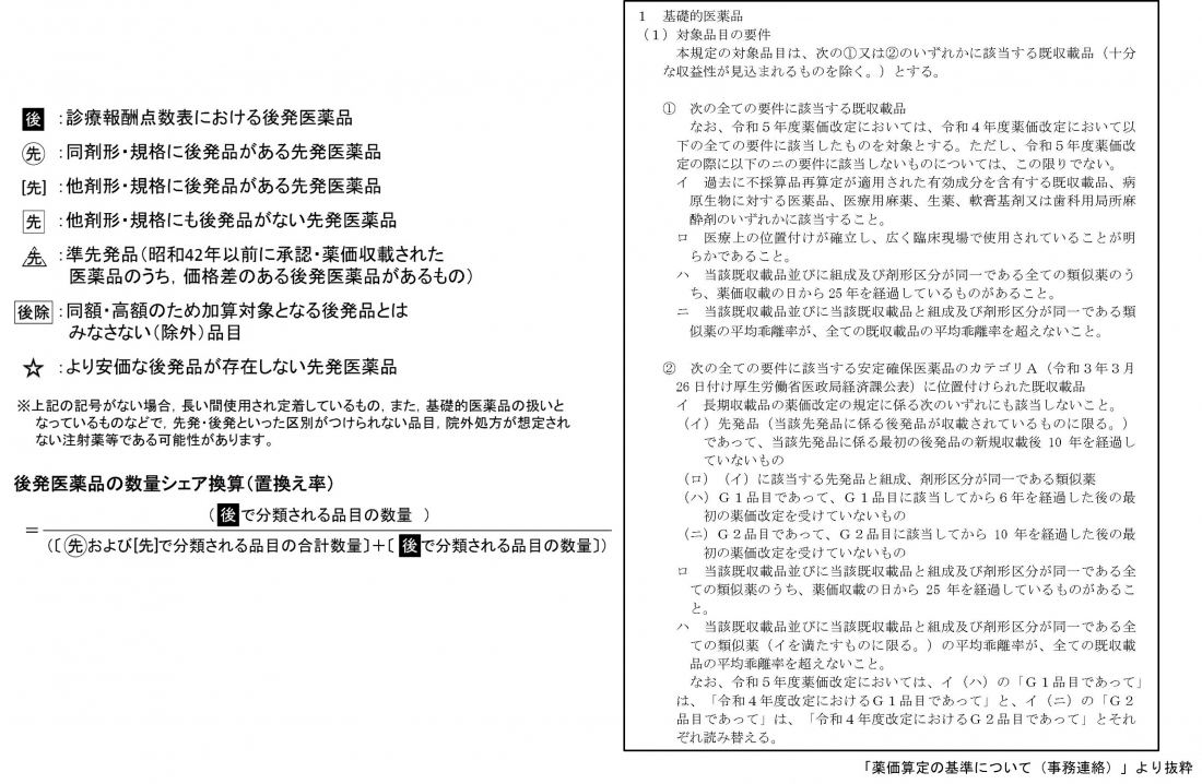 「基礎的医薬品」は,対象となる成分については薬価が維持され,「後発品の数量シェア(置換え率)の計算」には含まれません