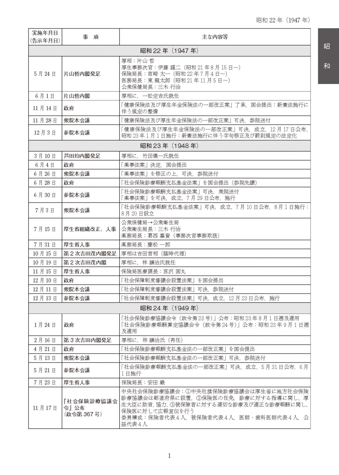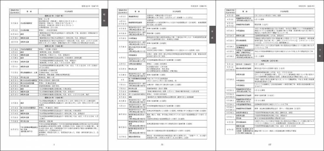 2015年発刊の『-中央社会保険医療協議会診療報酬改定の軌跡- 診療報酬アーカイブス1950~2014年』の冒頭資料「診療報酬改定を巡る中医協等の推移」をもとに,昭和25年4月の中央社会保険医療協議会の発足経緯から,令和4年4月の診療報酬改定までの,中医協で進められた診療報酬改定を巡る動向や関連審議会,診療報酬と関連する健康保険法等改正などの制度改正の流れのほか,当時の内閣や旧厚生省,厚生労働省の人事(一部)などを時系列で整理した年表となっています。