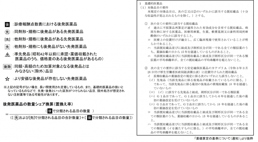 「基礎的医薬品」は,対象となる成分については薬価が維持され,「後発品の数量シェア(置換え率)の計算」には含まれません
