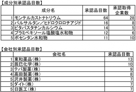会社別の承認品目数では,東和薬品(株)が13品目で最多ですが,全体の承認品目数も