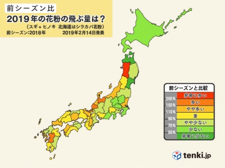「tenki.jp」では,2月14日に2019年の花粉飛散傾向の予測を発表しています。